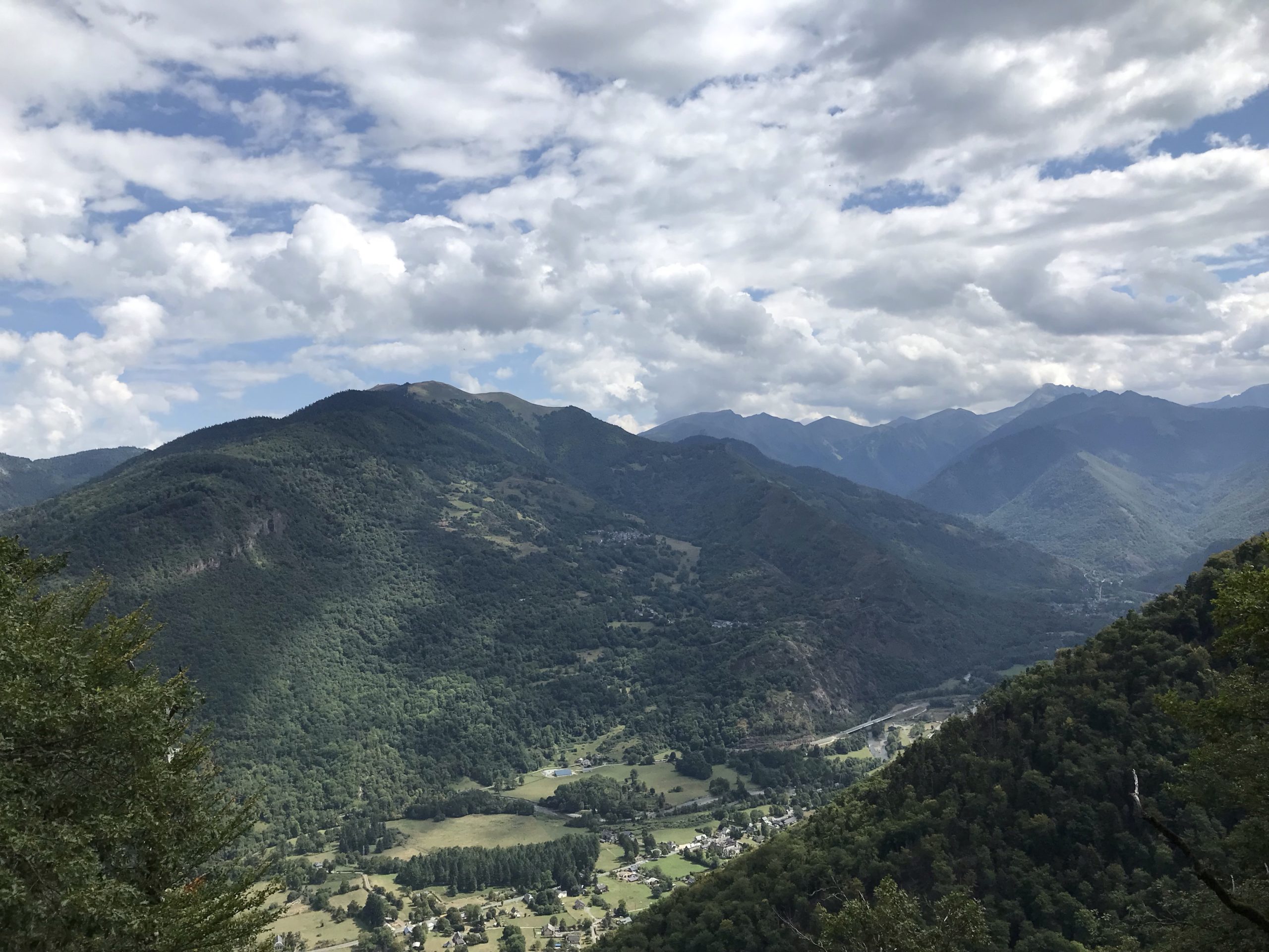 Vers la fin du parcours la piste est large au milieu de la forêt. Jusqu'à arriver sur un plateau avec une vue dégagée sur la vallée de la Garonne et Arlos.