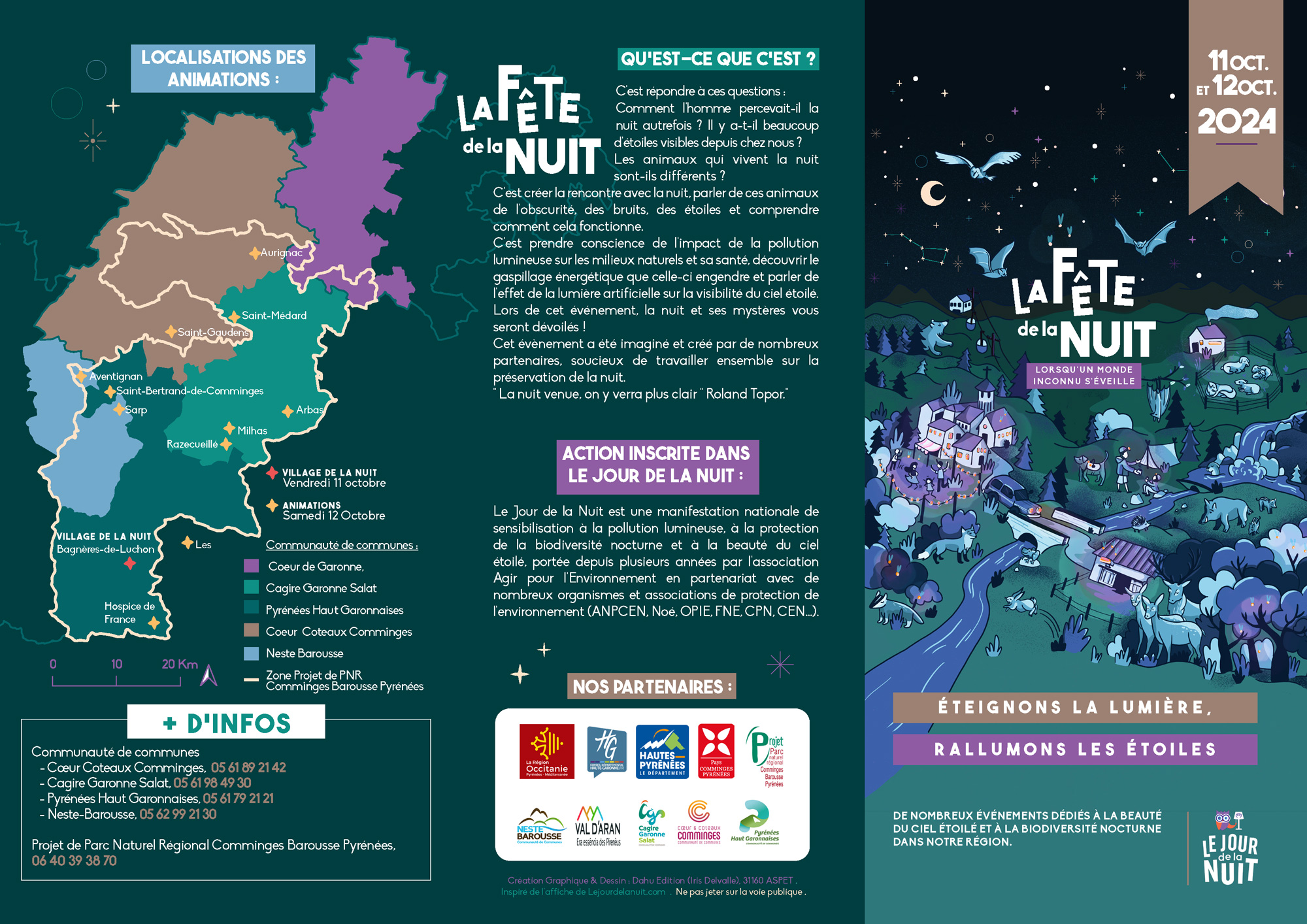 La Fête de la Nuit les 11 et 12 octobre 2024 sur les communautés de communes du Comminges et des Pyrénées, mais aussi du projet de Parc Naturel Régional Comminges Barousse Pyrénées. Organisée par l'association Agir pour l'environnement, la Fête de la Nuit vise à sensibiliser le public à l'importance de la nuit et à la biodiversité qui l'accompagne. En ces temps où l'éclairage artificiel perturbe les écosystèmes, cette initiative est d'autant plus pertinente. Le programme complet de la Fête de la Nuit s'étend des grottes de Gargas, à Luchon, en passant par Arbas, Saint-Médard, Milhas et Saint-Bertrand de Comminges. Le Val d'Aran participe également avec une diner des chauves-souris à Les.